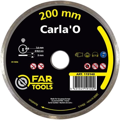 Far Tools disque diamant ::Carla’O HQ cobalt:: . Cette meule diamantée à tranchant continu convient pour la (re)coupe à l’eau de divers matériaux tels que les carreaux et le béton mou.:Le disque a une hauteur de jante de 5 mm, un diamètre de 200 mm et un alésage de 22,2 mm. Conseil : utilisez des lunettes de sécurité et des protections auditives lorsque vous meulez.