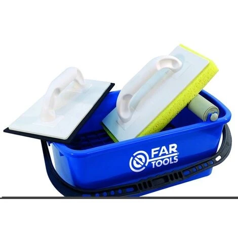 Kit complet pour rincer et finir la pose du carrelage. Bac de rinçage 10L, rouleau d’essorage, taloche semelle caoutchouc et taloche éponge.
